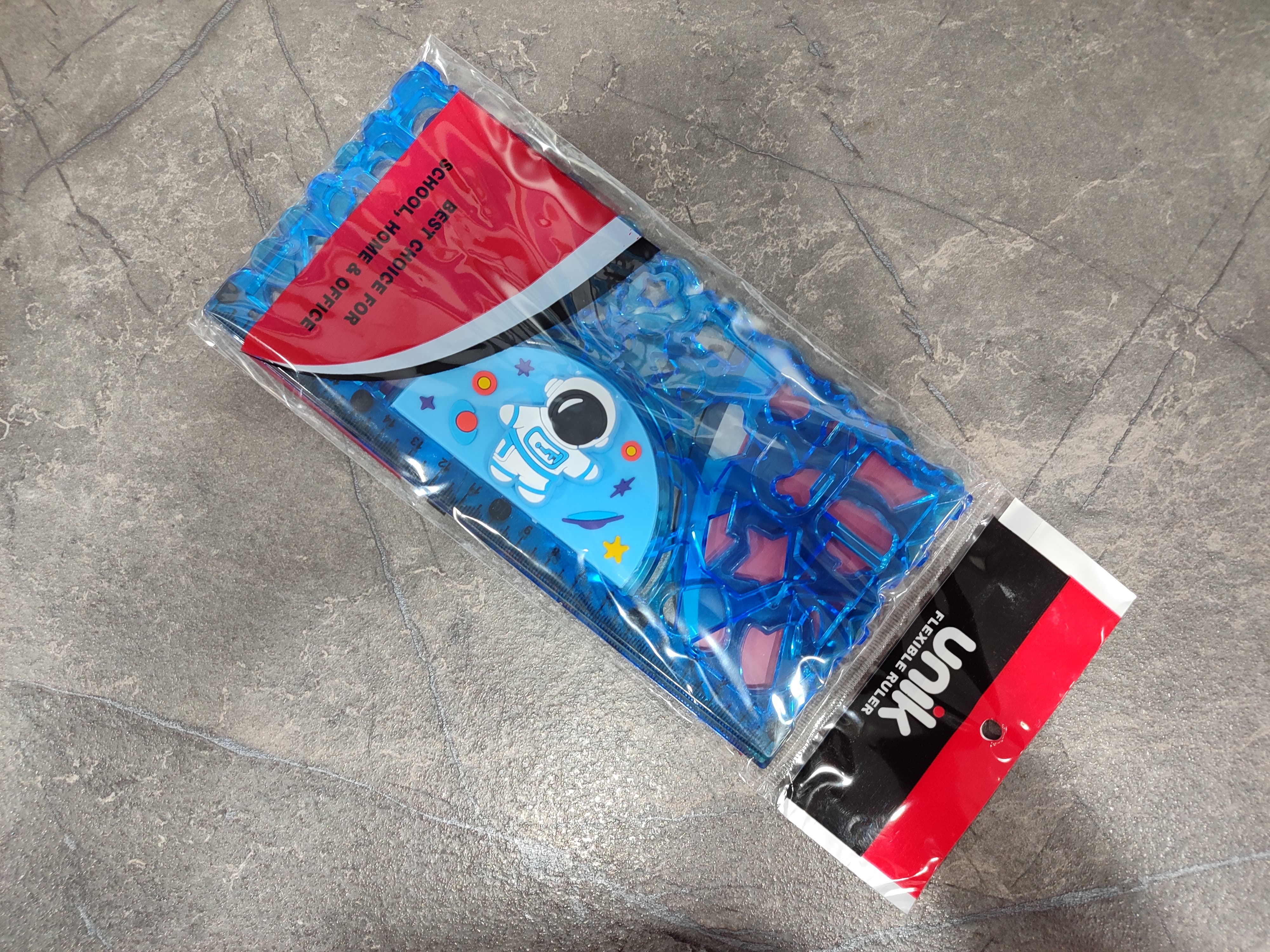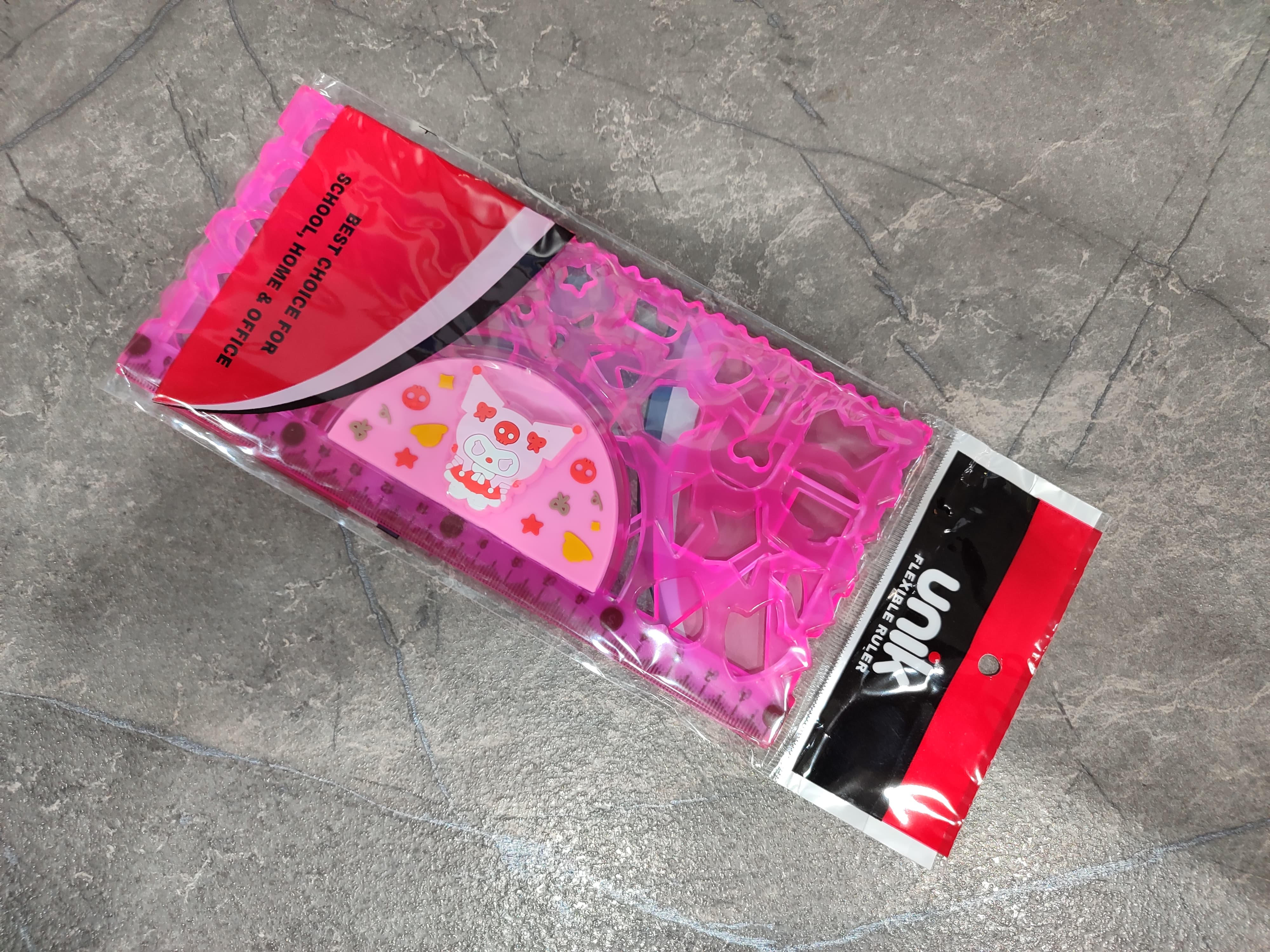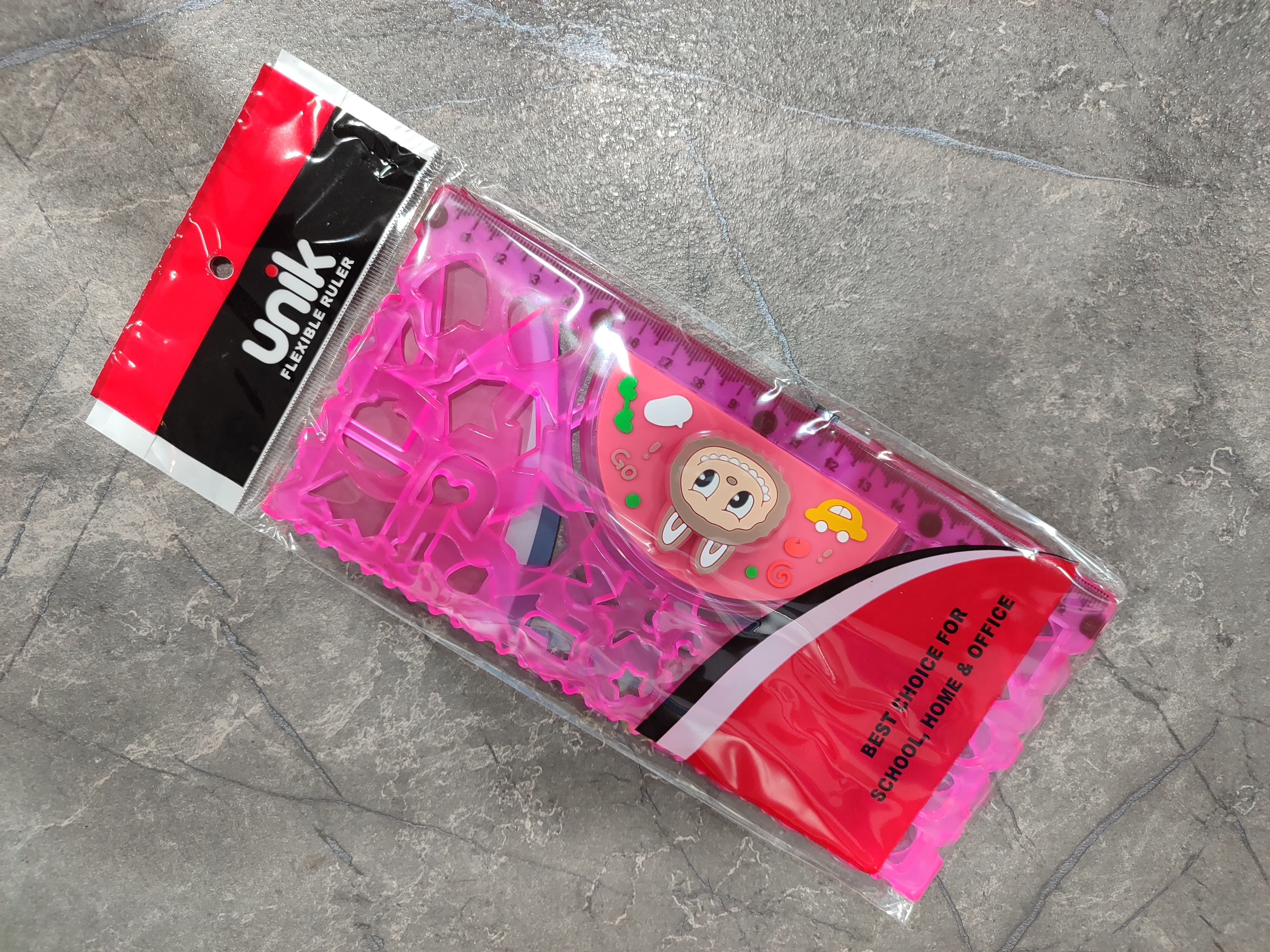 خطکش 30 سانتی ژله ای بهمراه اشکال هندسی و یک نقاله چسبیده به آن، برند Unik